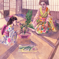 Dans cette série d'aquarelles, j'ai représenté la vie d'une Geisha de son enfance jusqu'à ses dernières années. La future Geisha (Maiko) commence par l'apprentissage puis devient maîtresse de son art (Geiko) jusqu'à transmettre un savoir-faire à une Maiko. Elle parcours maîtrise différents arts qui sont représentés sur ces aquerelles :